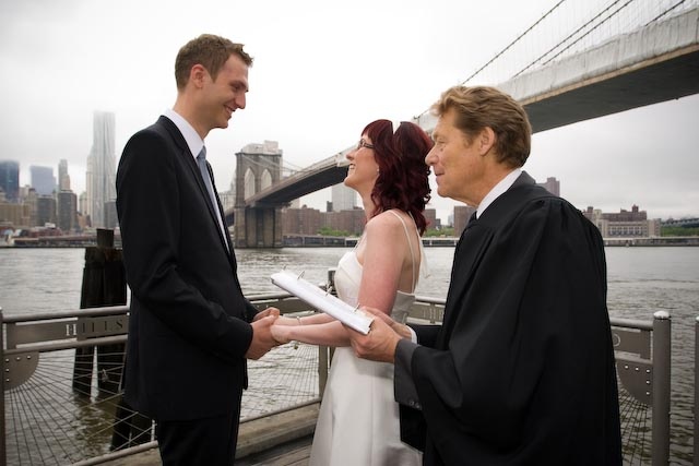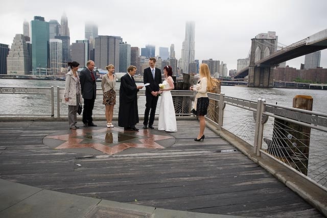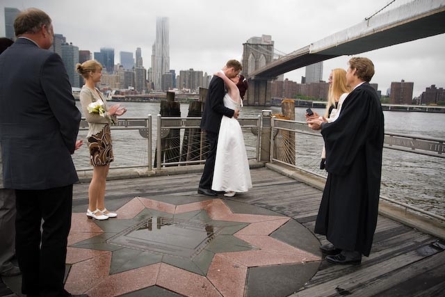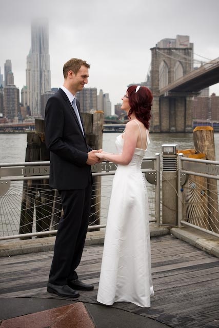 Der Tag begann entspannt im Juniors in der Grand Central Station mit einem echten New Yorker Cheescake. Danach hieß es das sich das Brautpaar für ein paar Stunden für die Vorbereitungen trennt. D. h. die Braut begab sich im Laufschritt mit ihrer Trauzeugin zum Hotel, denn man war etwas spät dran. Dann ging es Schlag auf Schlag – Haare, Make up, Kleid anziehen und die letzten Minuten gespannt warten. Um 13:30 Uhr versammelten wir uns alle in der Lobby in unserem Hotel (Braut, Bräutigam, Eltern, Schwester, Trauzeugin, Friedensrichter, Fotografin und unser Organisator). Da es bereits seit zwei Tagen durch geregnet hat und auch in diesem Moment regnete, überlegten wir über einen anderen Trauungsort als an der Brooklyn Bridge. Voller Hoffnung das das Wetter es gut mit uns meint, haben wir uns auf zwei Taxis aufgeteilt. Kaum sind wir am Ort des Geschehens angekommen, hat es der liebe Wettergott es gut mit uns gemeint und seine Ergüsse die nächsten drei Stunden gestoppt. Dann begann die Trauung um 14:20 Uhr und um 14:39 Uhr durften wir uns Mann und Frau nennen.