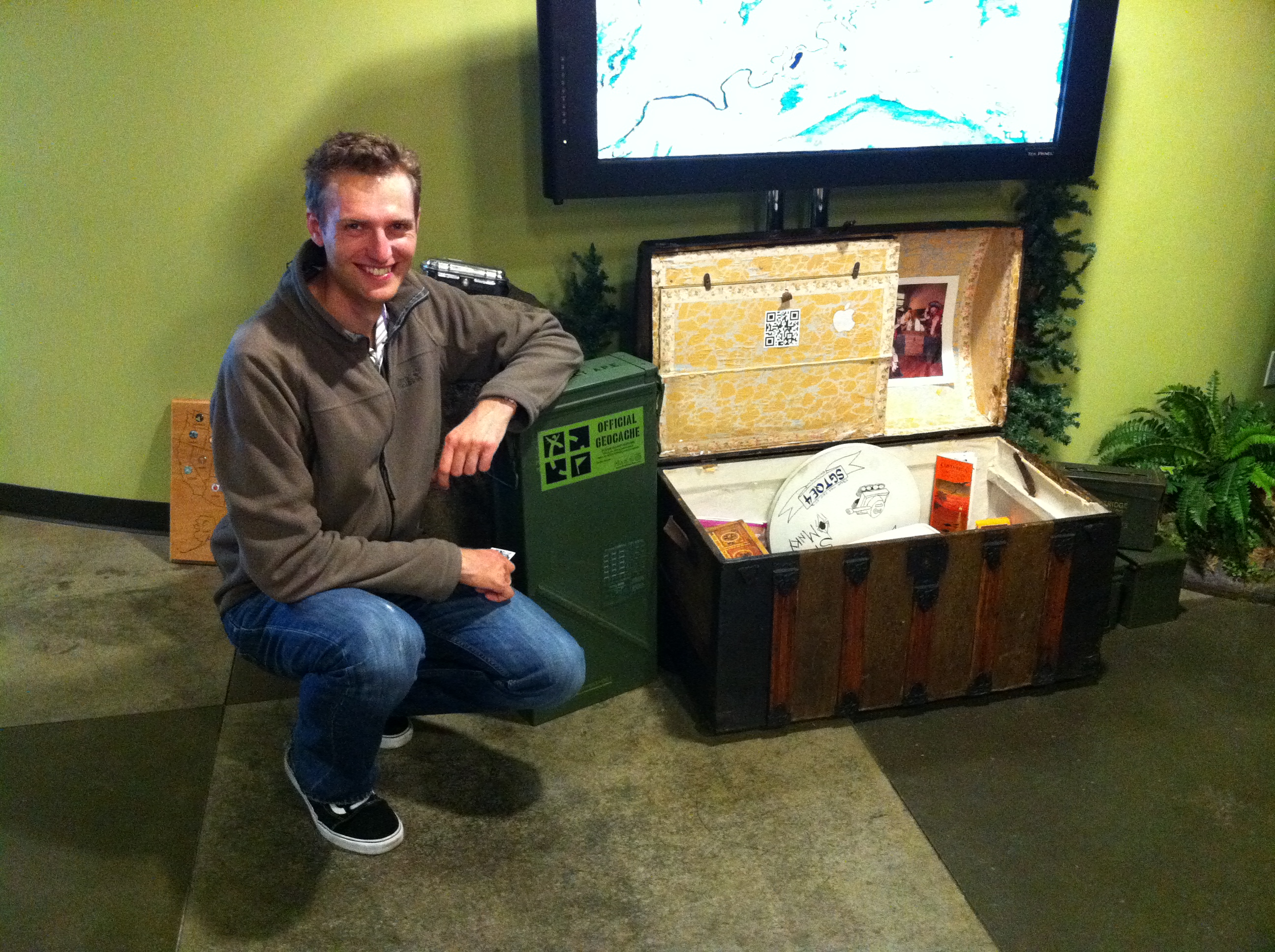 Wir werden sehr nett begrüßt und gefragt ob wir den Cache „heben“ möchten. Der Cache im HQ ist eine gigantische „Dose“ in Form einer Schatzkiste. Das Logbuch ist tatsächlich ein richtiges Buch. Außerdem kann man viele kleinere Dosen mit verschiedenen Aufschriften vorfinden: TB’s mit Zielen in den USA, TB’s mit Zielen außerhalb der USA, Coins usw. Wir werden in einen Fotoautomaten geschickt wo ein Filmstreifen mit 4 Bildern gemacht wird. Es kommen 2 Ausgaben heraus, eine zum mitnehmen und eine zum anheften an die Wand in der Lobby 🙂