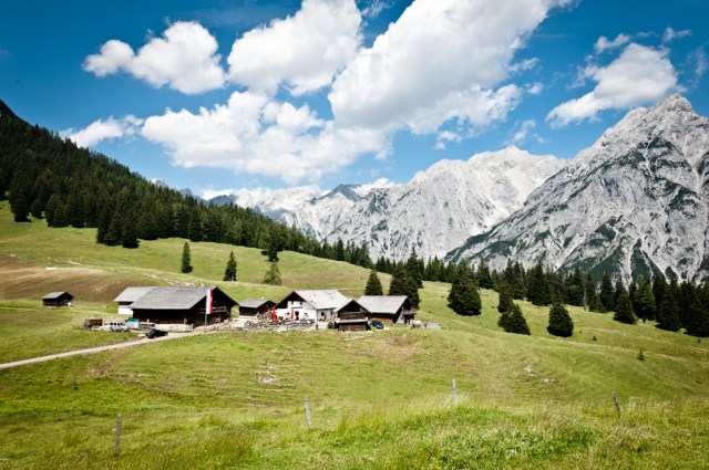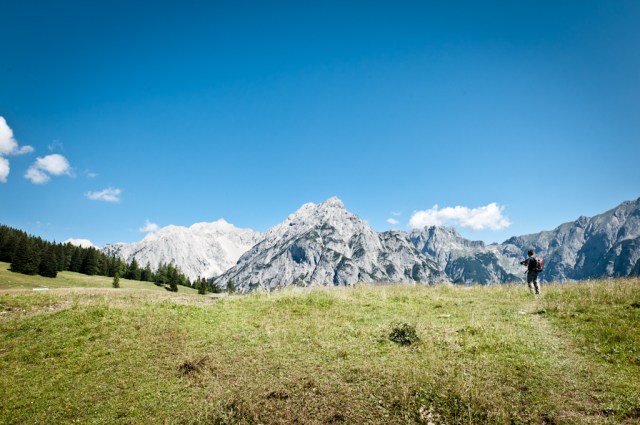 Wir können die Hinterhornalm sehen, also kann es auch nicht mehr allzu weit bis zur Walderalm sein. Tatsächlich kommen wir kurz darauf an. Wir stärken uns mit Speckknödlsupp’n und einer Brettljause.