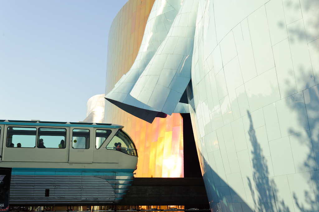 Wir landen in der Innenstadt und müssen noch ein Stück Weg zurücklegen um ins Hotel, nahe dem „Space Center“, zu kommen. Zum Space Center fahren wir mit der, zur Weltausstellung von 1962 errichteten, Monorail (folgendes Foto). Angekommen, bestaunten wir bereits zum ersten Mal die Space Needle und das Seattle Center Areal. Das allerletzte Stück gehen wir einfach zu Fuss. 🙂