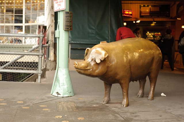 Der größte Teil des Pike Place Markets ist eine Halle und somit überdacht. Man findet innerhalb den bekannten Fischhändler, wo der Fisch geworfen wird. Sehr sehenswert. Wo man nur schwer vorbei kommt ist unweit der Donut Stand „Daily Dozen Donut Company“. Die wohl besten Donuts der Welt 🙂 Neben unzähligen Läden, steht hier auch Rachel, das lebensgroße Sparschwein. Der Erlös geht an die Obdachlosen, von denen es hier leider zahlreiche gibt.
