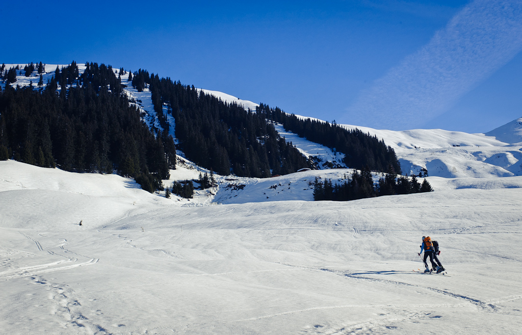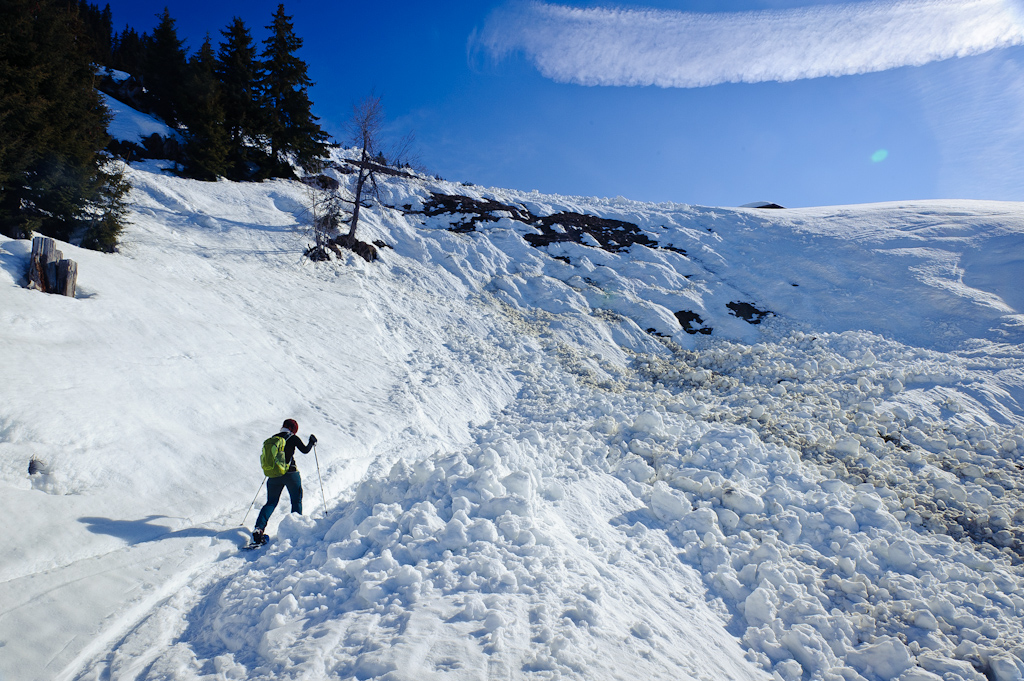 Als wir den Wald verließen, erschloss sich uns ein tolles Panorama. Einzig eine Tatsache dämpfte etwas unsere Laune, nämlich diese Lawine die hier vor ein paar Tagen abgangen ist. Wir machten ein paar Fotos und ein paar Skitourengeher überholten uns. Sie prüften den Schnee, waren sich auch nicht ganz so sicher, gingen aber schlussendlich weiter. Wir gingen auch weiter, allerdings mehr so auf Forststraßen.