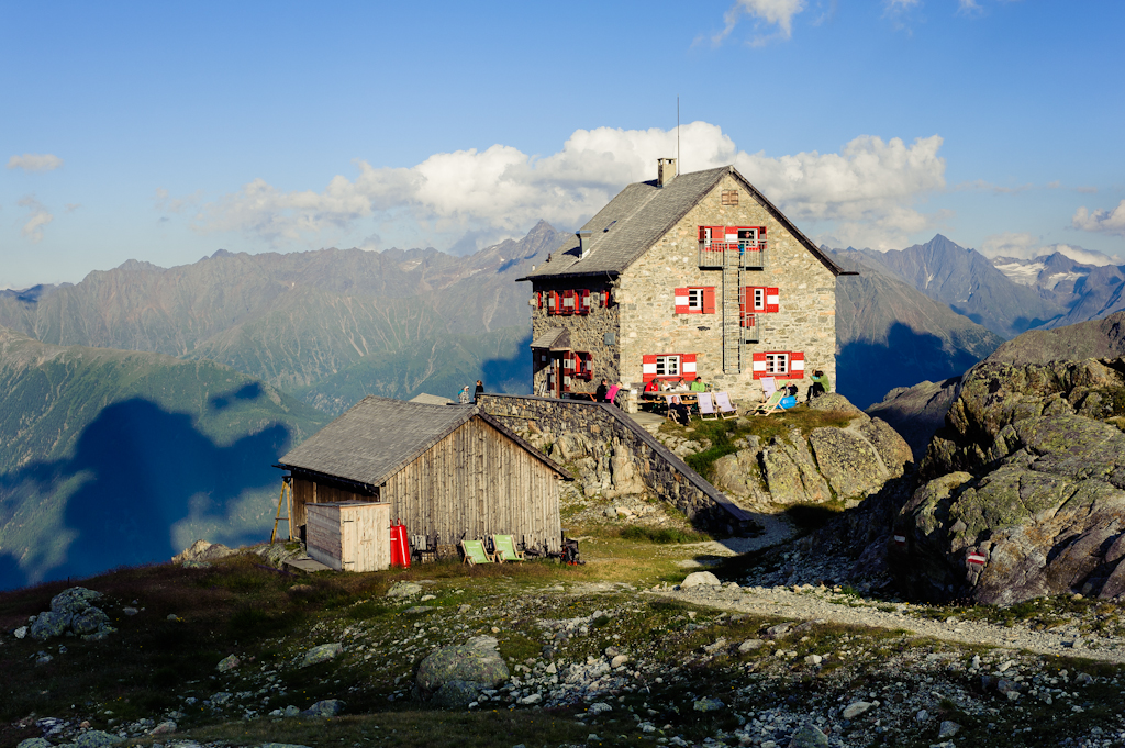 Was für ein langer und beschwerlicher Aufstieg, mehrmals wollten wir aufgeben. Unser Weg führte uns von Umhausen (ca. 1000m) zur Leierstalalm und von dort aus weiter zur Hütte. Es traf uns fast der Schlag, als wir die Ebene der Leierstalalm erreichten und die Erlanger Hütte sich das erste Mal zeigte, „Dort sollen wir noch hin?“. Naja, wir rauften uns zusammen und stiegen weiter auf. Je näher wir der Hütte kamen, desto mehr Pausen legten wir ein. Der Blick aufs GPS verriet uns alle paar Minuten wieviele Höhenmeter noch vor uns lagen, es wollte einfach nicht voran gehen. Schwer erschöpft und fast schon mit Tränen in den Augen erreichten wir schlussendlich doch die Hütte (sind halt doch Flachlandtiroler :-)) und wurden herzlich empfangen.