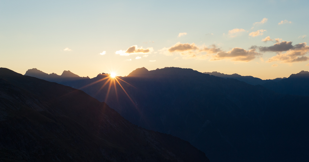 Nach dem Bezug des Matratzenlagers gab es dann eine deftige Stärkung und reichlich gekühlte Getränke. LEIDER hatten wir keine Ohropax dabei und wurden zwar mit einem klaren Sternenhimmel aber eben auch einer schlafenlosen Nacht belohnt. Irgendwie war es nicht einmal schlimm als das Handy zum Sonnenaufgang rief. 🙂 Wir genossen diesen (trotz ausgebuchter Hütte) komplett allein.