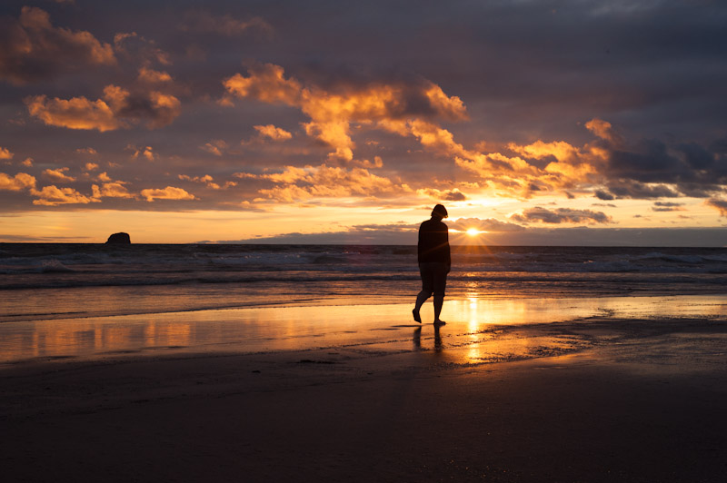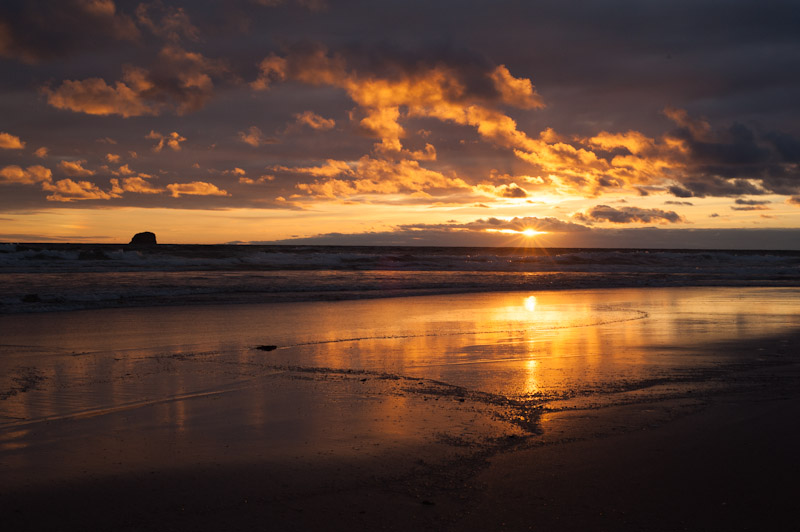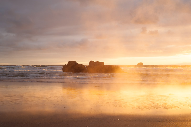 An diesem Strand gibt es Thermalquellen im Sand (die bei Ebbe zugänglich sind). Gräbt man sich ein Loch, hat man einen heißen Pool direkt am kalten Pazifik. Der Punkt an dem ganzen Spaß ist die Ebbe (low tide), man hat gut 2 Stunden vorher und nachher Zeit um sich sein Loch zu graben und sich hineinzulegen. Gestern war das um 6:50 Uhr!! Durch die Zeitverschiebung sind wir aber momentan noch jeden Morgen recht früh wach. So kamen wir auf die Idee uns auch gleich den Sonnenaufgang anschauen. Ganz so gut ging es dann mit dem Aufstehen doch nicht, wir schafften es gerade noch rechtzeitig an den Strand und genossen das Schauspiel.