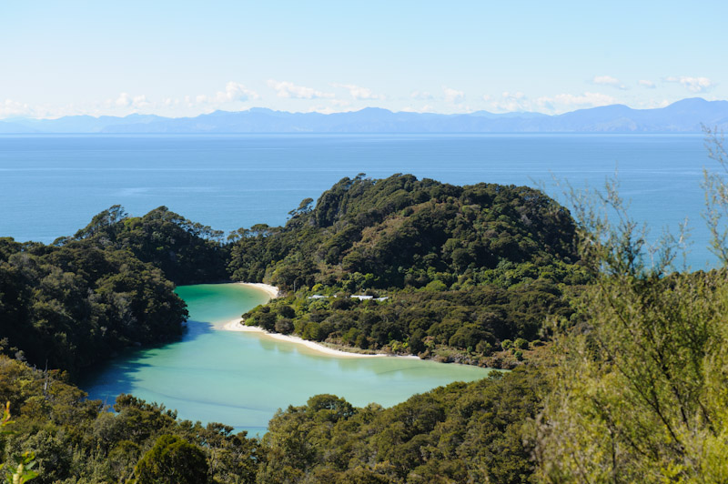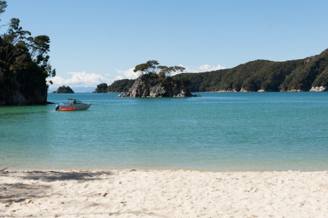 Heute hieß es nun endlich mal wandern. 🙂 Dazu fuhren wir mit einem High-Speed Wassertaxi zur „Bark Bay“ und wanderten das Teilstück auf dem oben genannten „Abel Tasman Coast Track“ zurück. Klingt jetzt vielleicht weniger aufregend, hat es aber in sich. Zum einen von der Aussicht her und zum anderen von der Länge, nämlich über 20KM. Außerdem ging es immer wieder 100 HM hoch und dann wieder runter. Ja die Aussicht -> Wie der Name schon sagt geht es primär an der Küste und (Traum)Stränden entlang. Das sieht dann in etwa so aus: