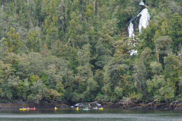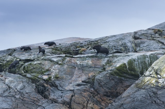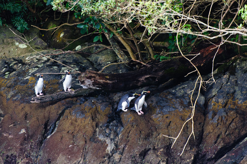 Gegen 7 Uhr waren wir dann auch schon wieder auf den Beinen und frühstückten. Der Nature-Guide rief wieder alle zusammen – er hat Pinguine ausfindig gemacht, also schnell wieder raus. Und so ging es dann immer hin und her. Durch die starken Regenfälle war der Sound/Fjord von Wasserfällen gesäumt. Mal größer, mal kleiner – an einer Stelle machten wir dann halt und der Skipper schaltete alles was Lärm macht ab. Die Crew nennt das „Sound of Silence“. Niemand darf sich bewegen, was sagen oder gar ein Foto machen 🙂 Rings herum rauschte es wie man Wasserfälle noch nie rauschen hat hören. Drei Minuten dauerte das Hörspiel. Nachher ging es weiter zum Anleger wo uns der Bus wieder abholte. Der Rest ist ähnlich wie bei der Anreise, nur waren alle irgendwie „müder“. Hier noch ein Foto mit Pinguinen: