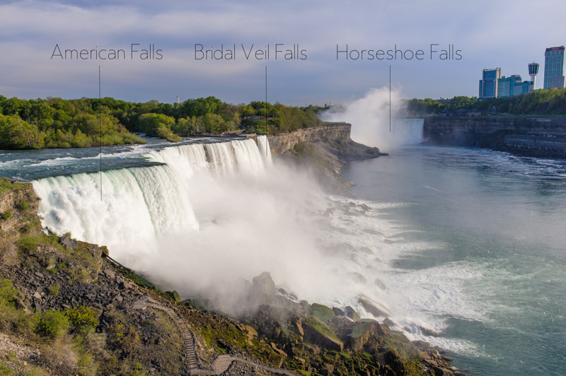 Das Wichtigste: Die Niagarafälle bestehen aus dem Horseshoe Fall (oder auch Canadian Falls), den American Falls und den Bridal Veil Falls. Man findet alle am Niagara River, welcher den Eriesee mit dem Ontariosee verbindet. Der Niagara River ist an dieser Stelle auch die Grenze zwischen den USA und Kanada. Auf beiden Seiten liegt das Örtchen „Niagara Falls“, einmal im Bundesstaat New York (USA) und einmal in Ontario (Kanada). Die „Rainbow Bridge“ verbindet die beiden Ortschaften/Städte.
