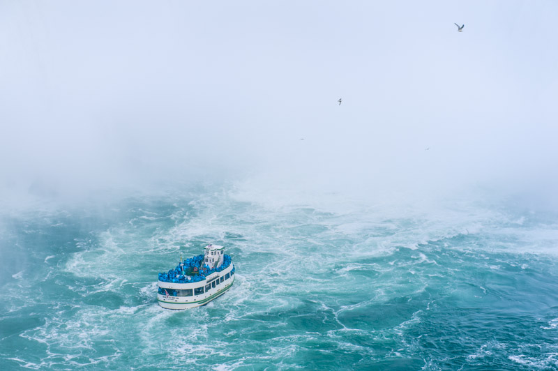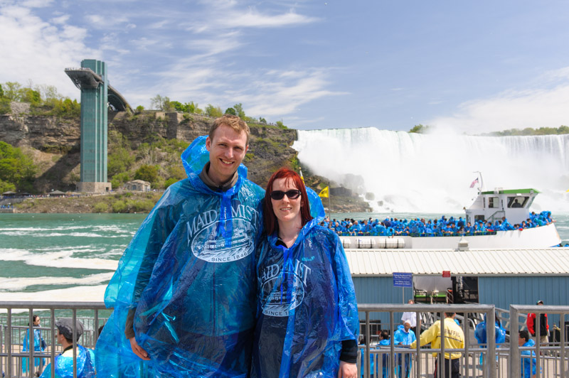 Wie oben beschrieben, kann man mit einem Boot zum Horseshoe Fall fahren. Wir müssen noch bis zum Check-In in unser Zimmer warten und so bietet sich eine Mitfahrt an. Anfühlen tut es sich wie eine große Dusche 🙂 Ein Poncho hält das meiste von der Kleidung ab: