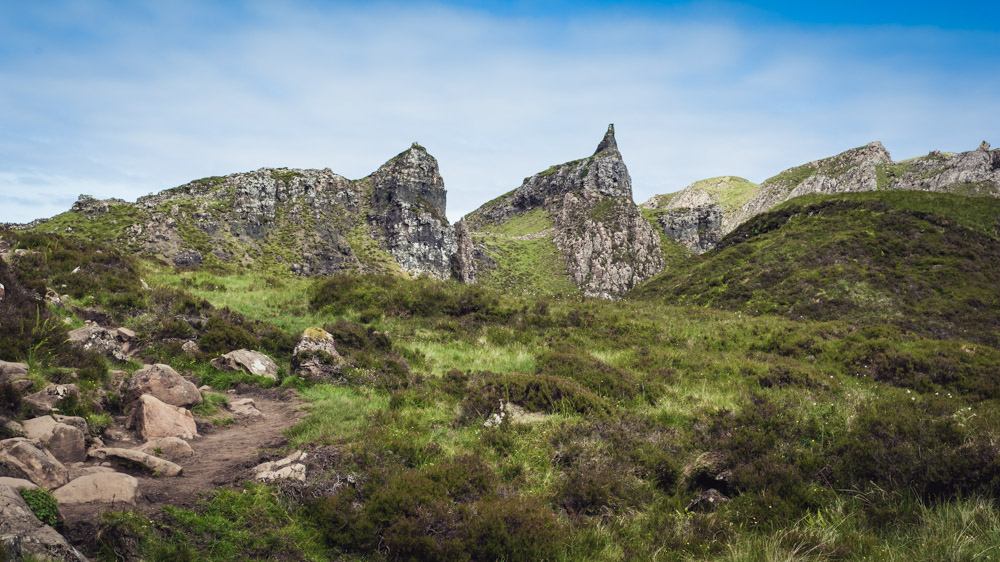 Nördlich von Portree, auf der Halbinsel Trotternish, liegt der Quiraing. Durch einen Hangrutsch sackte hier alles ab. Die stehen gebliebenen Felsen bilden das sogenannte Felslabyrinth.