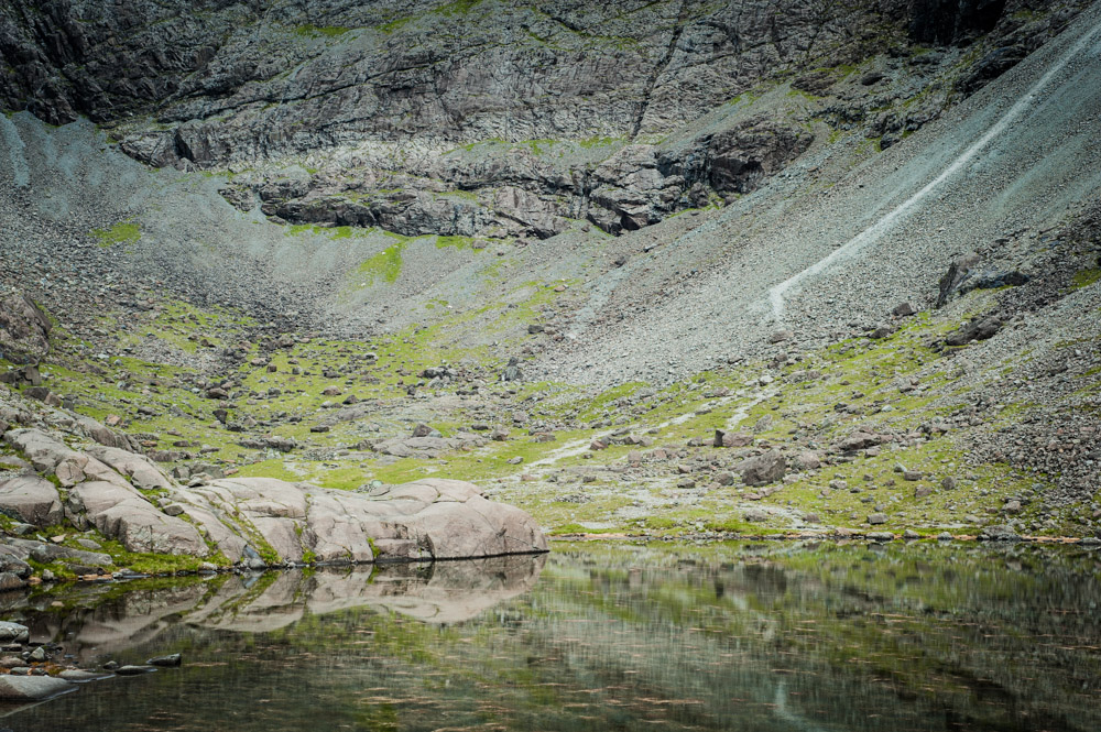 Weit hinten, an der Bucht des Loch Brittle liegt ein kleiner Campingplatz. Von hier starten wir zu unserer Wanderung ins Coire Lagan, eine vom Eis geformte Schlucht.