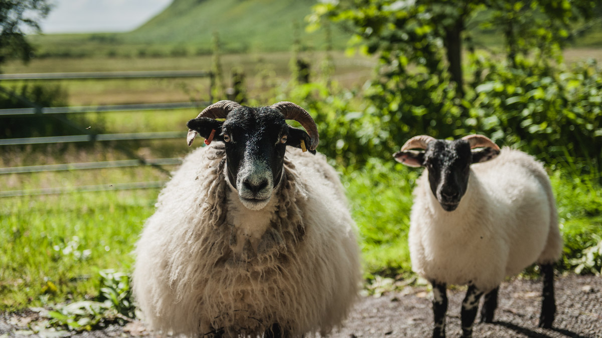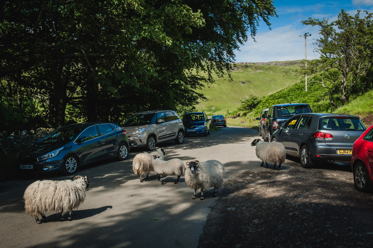 Als unsere Führung zu Ende war, wechselte das Wetter schlagartig. Wir entschieden spontan noch die Talisker Bay zu besuchen. Am Parkplatz begrüßte uns neben ein paar Schafen auch noch blauer Himmel.