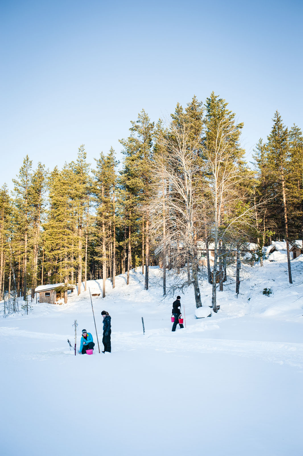 Wir fuhren durch Wälder und über Seen und nach ca. 30 KM kamen wir auch schon an und bezogen unser Lager. Inzwischen gab es eine gewisse Routine … Es wurde wieder ein Loch ins Eis gehauen (diesmal von Verena) und überall eingeheizt.