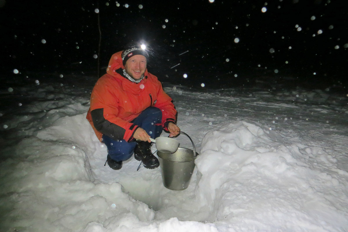 Der erste Tag führte uns zu der kleinen Hütte Kangos. Wie alle unserer Hütten liegt sie idyllisch am See, hat aber einen eigenen Brunnen. Während die Suppe vorbereitet wird, wird Feuer gemacht, Wasser geholt und Holz gehackt. Außer der Hütte wird auch die Sauna eingeheizt und der dortige Boiler mit Wasser gefüllt. Da es immer einen Abfluss im Boden gibt, kann man sich nach dem Saunagang immer mit Wasser übergießen. Auf dem Weg zur Sauna rutscht Falk übrigens aus landet im tiefen Schnee. Immerhin hatte er wenigstens ein Handtuch „an“. 😛