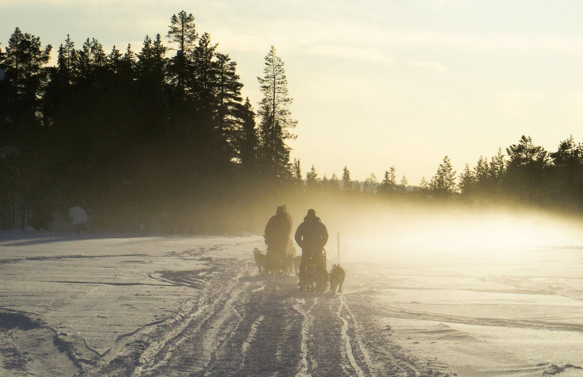 Der nächste Morgen begrüßte uns mit einem Traumwetter. Beim Vorbereiten der Hunde fuhren Ski-Doos über den See und die Sonne tauchte alles in ein tolles Licht.