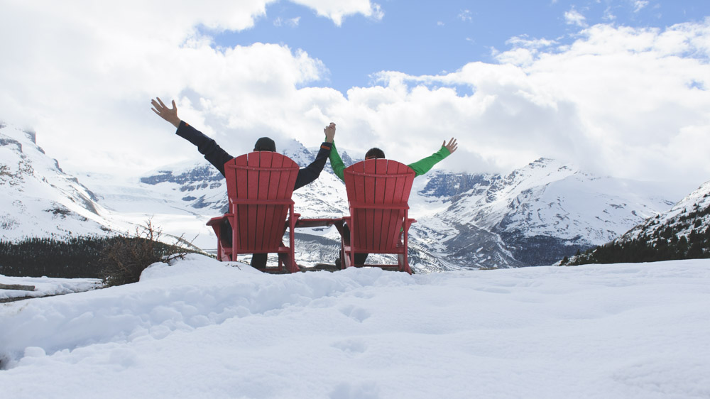 Natürlich dürfen auch die roten Stühle nicht fehlen. Unweit des Discovery Centre kann man in Richtung Wilcox Pass wandern. Nach ca. 40 Minuten kann man gemütlich Platz nehmen. 🙂 Achtung: Auch im Mai ist es hier ziemlich schneebedeckt und gutes Schuhwerk ist gefordert. Stöcke sind sehr empfehlenswert (wir hatten unsere im Camper :-)).